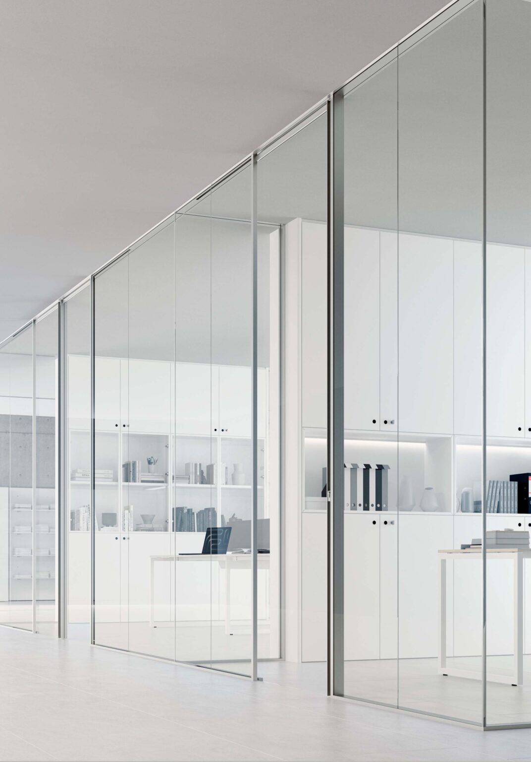 Completing the system are full-height hinged or sliding doors. The frame and door jamb are in aluminium. The standard door module requires a usable space of passage measuring at least 90 cm. The handle height is 100 cm above the floor.