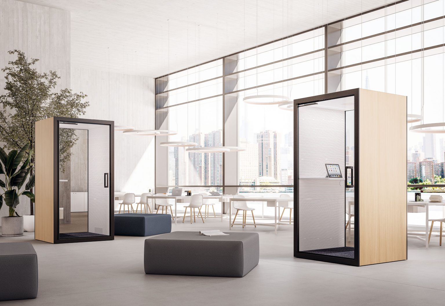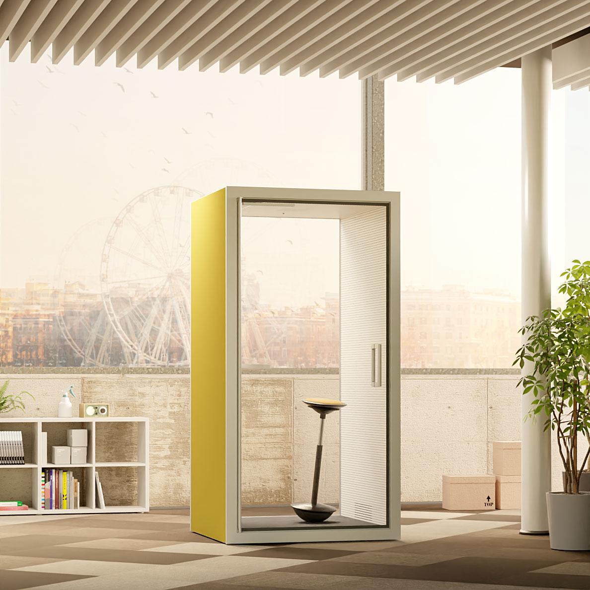 Un’isola acustica confortevole e luminosa. In solo 120×120 cm questo pod offre un phone booth facilmente posizionabile e integrabile in ogni ambiente, movimentabile anche assemblato, grazie alla struttura autoportante.