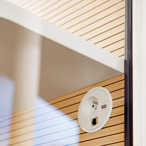 Il phone booth Mini offre un’elevata qualità acustica: vetro e guarnizioni contribuiscono all’isolamento dall’esterno mentre i pannelli fonoassorbenti 4Akustik® garantiscono il fonoassorbimento interno.