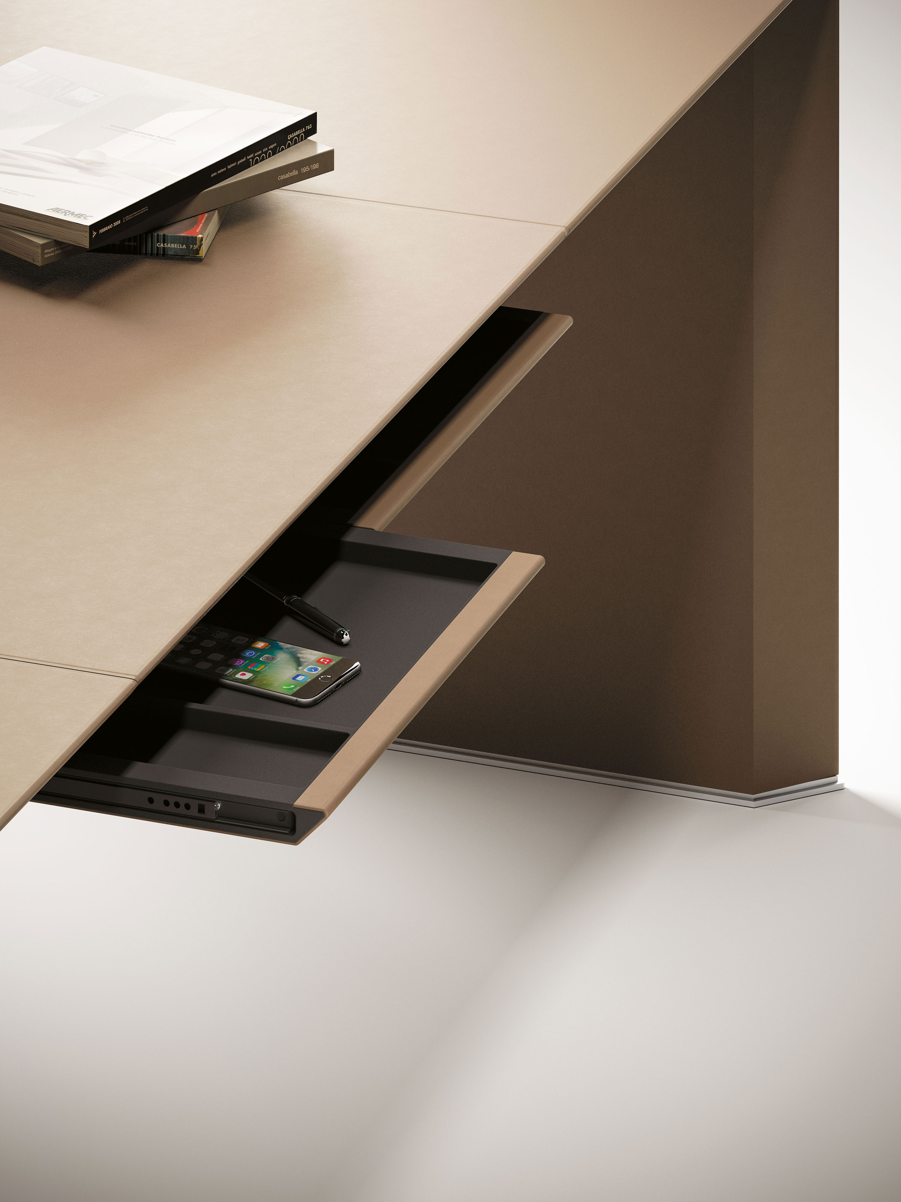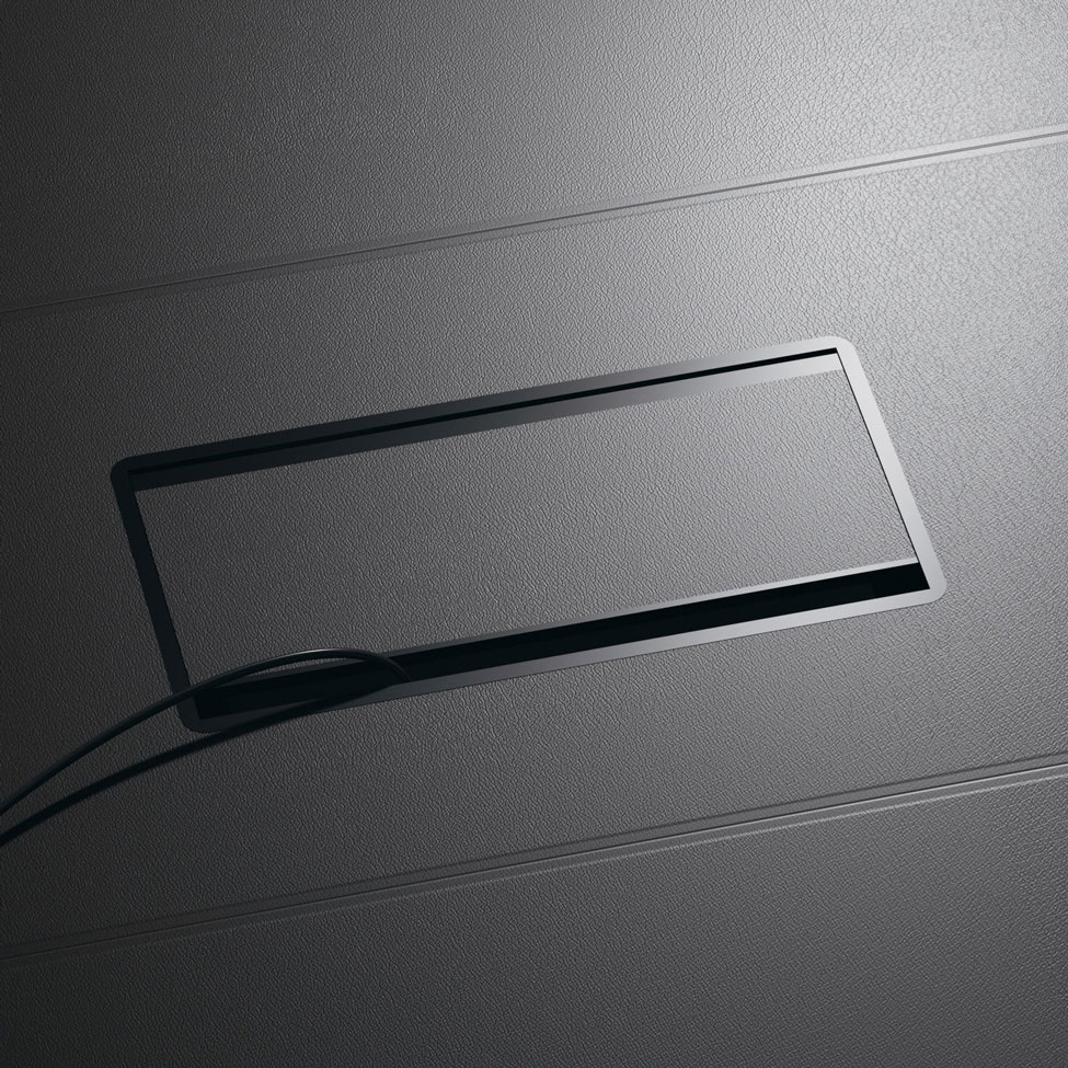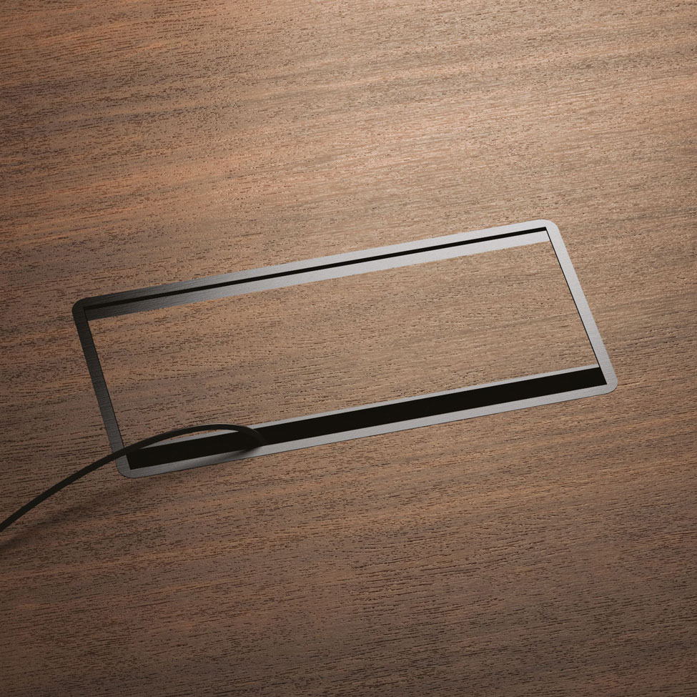L’estetica contemporanea nasce da materiali pregiati: il cuoio oppure l’impiallacciatura in rovere – rispettivamente per piani di spessore 7 e 5 cm – permettono di caratterizzare in maniera unica ogni ambiente.