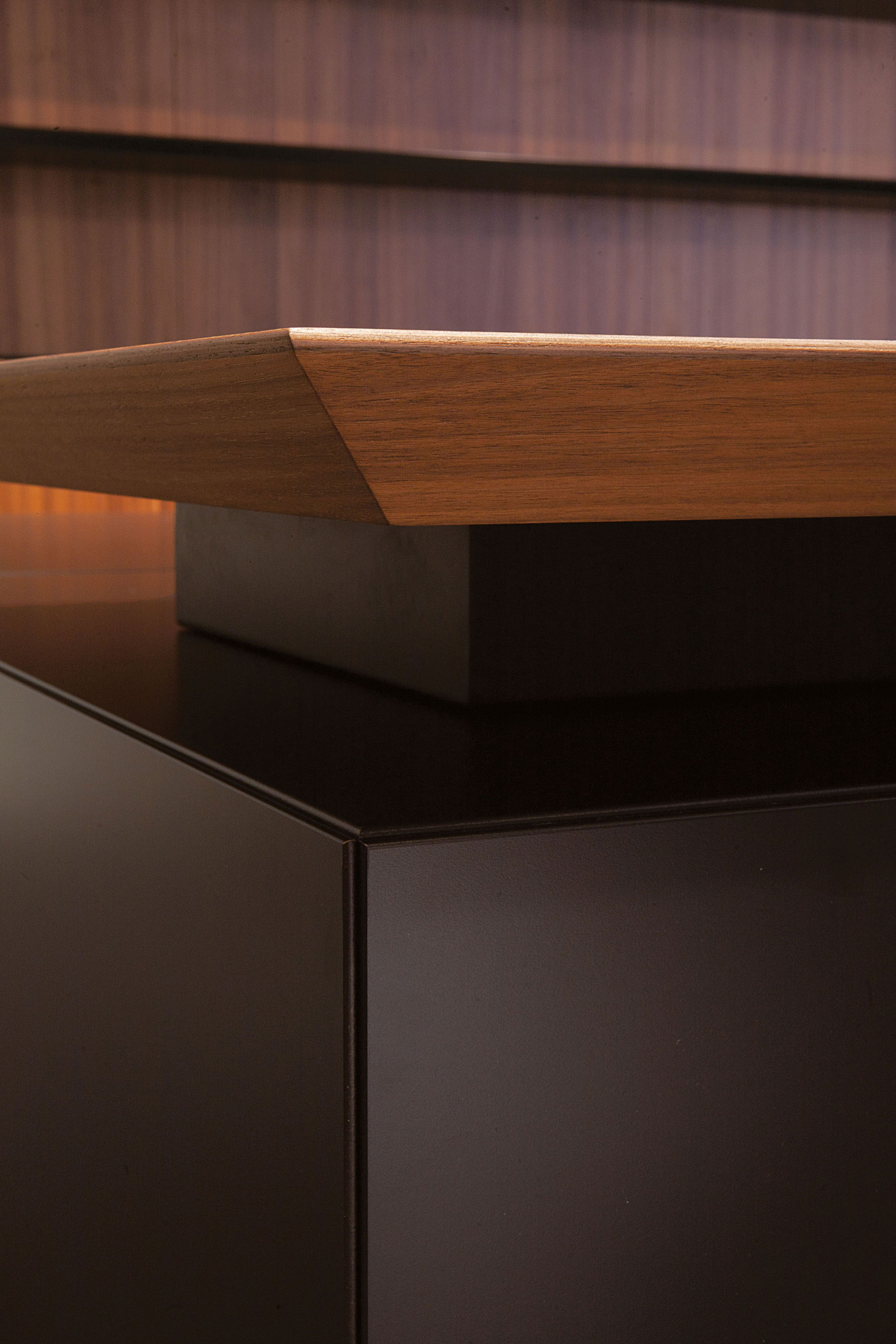 Il sistema è l’evoluzione di un classico Fantoni, la serie Multipli ideata nel 1968 da Gino Valle con Herbert Ohl. Il caratteristico taglio dei piani a 45° e la modularità degli elementi trovano in Multipliceo nuova vita.