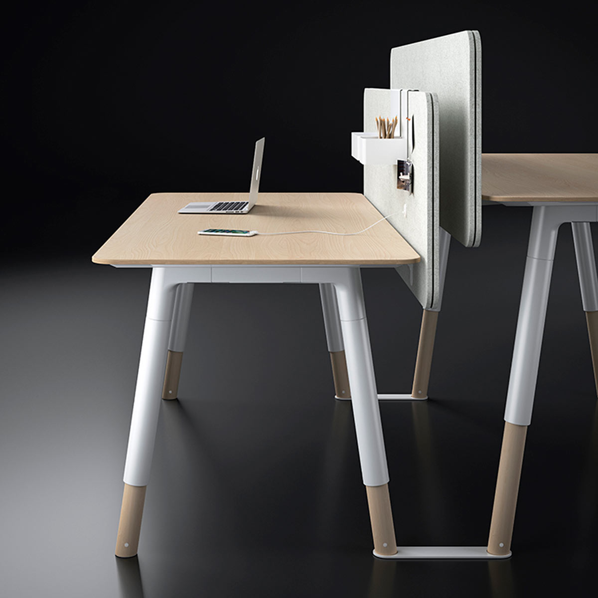 Un principio che attraversa diverse collezioni e arredi Fantoni, una soluzione che trasforma i tavoli in postazioni personalizzate, ergonomiche e confortevoli, particolarmente adatte per ambienti lavorativi dinamici e informali.