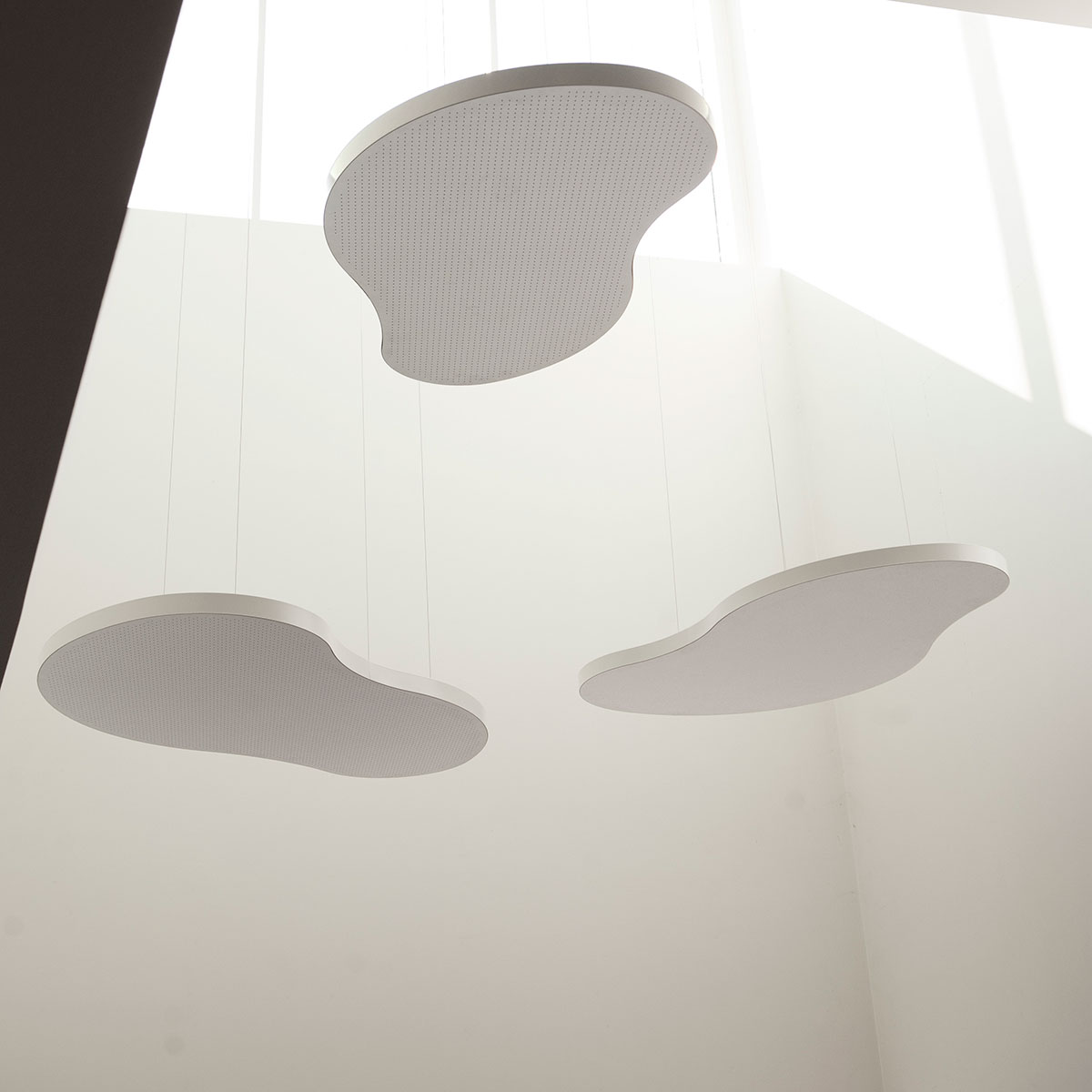 Sistema di pannelli sospesi, caratterizzato da forme indistinte e personalizzabili. Una forma base, curvilinea, coniugata su tre misure scalari permette di personalizzare il soffitto dando vita a innumerevoli diverse configurazioni.