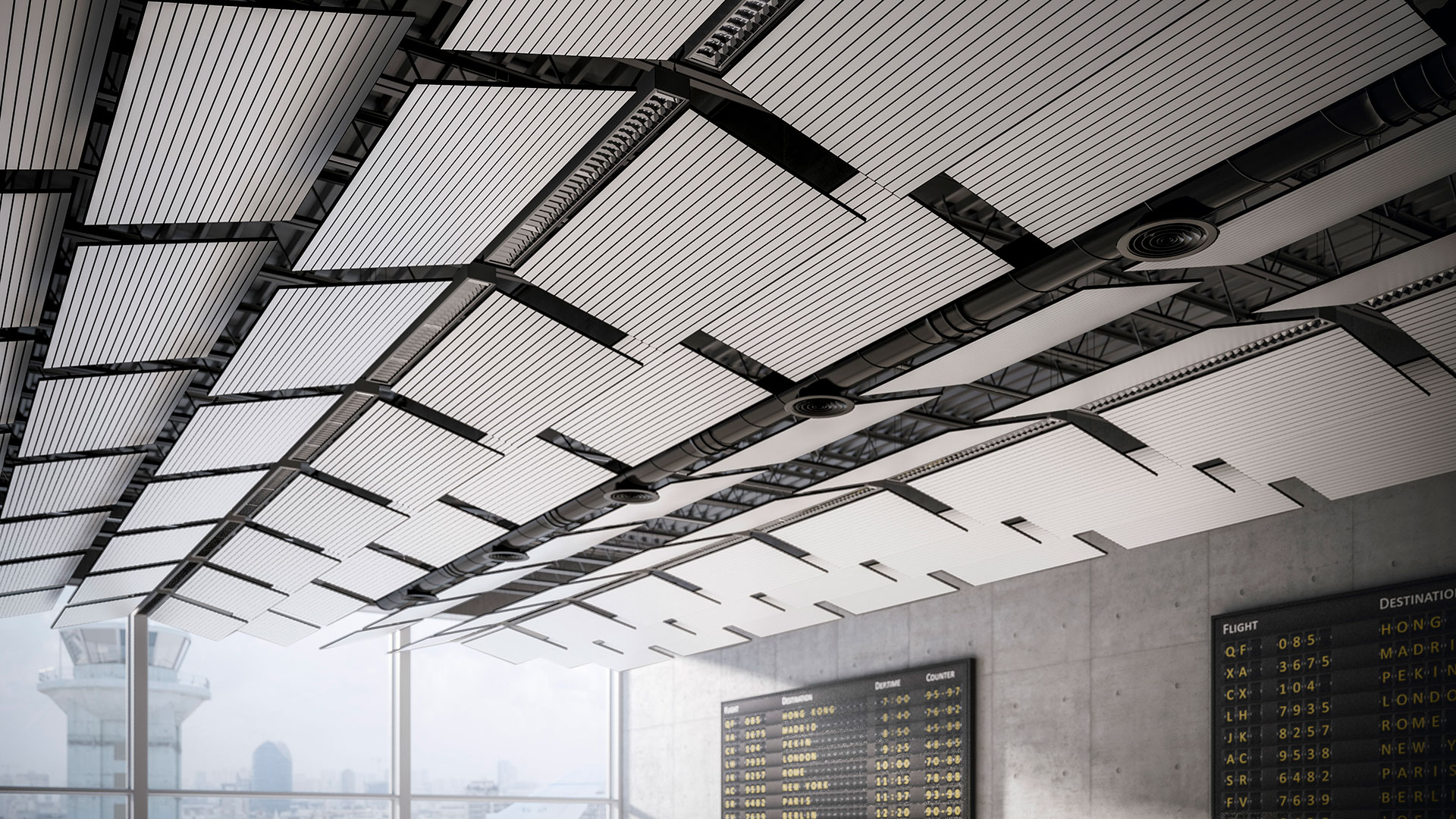 Myflag è un sistema di lame verticali sospese al soffitto per definirne un’estetica ideale, la cui particolare configurazione facilita l’attenuazione del riverbero. Le dimensioni delle lame e la distanza fra esse viene di volta in volta determinata a seconda delle caratteristiche architettoniche dell’interno, senza influire sul volume generale dell’ambiente né impedire l’accesso agli impianti esistenti.