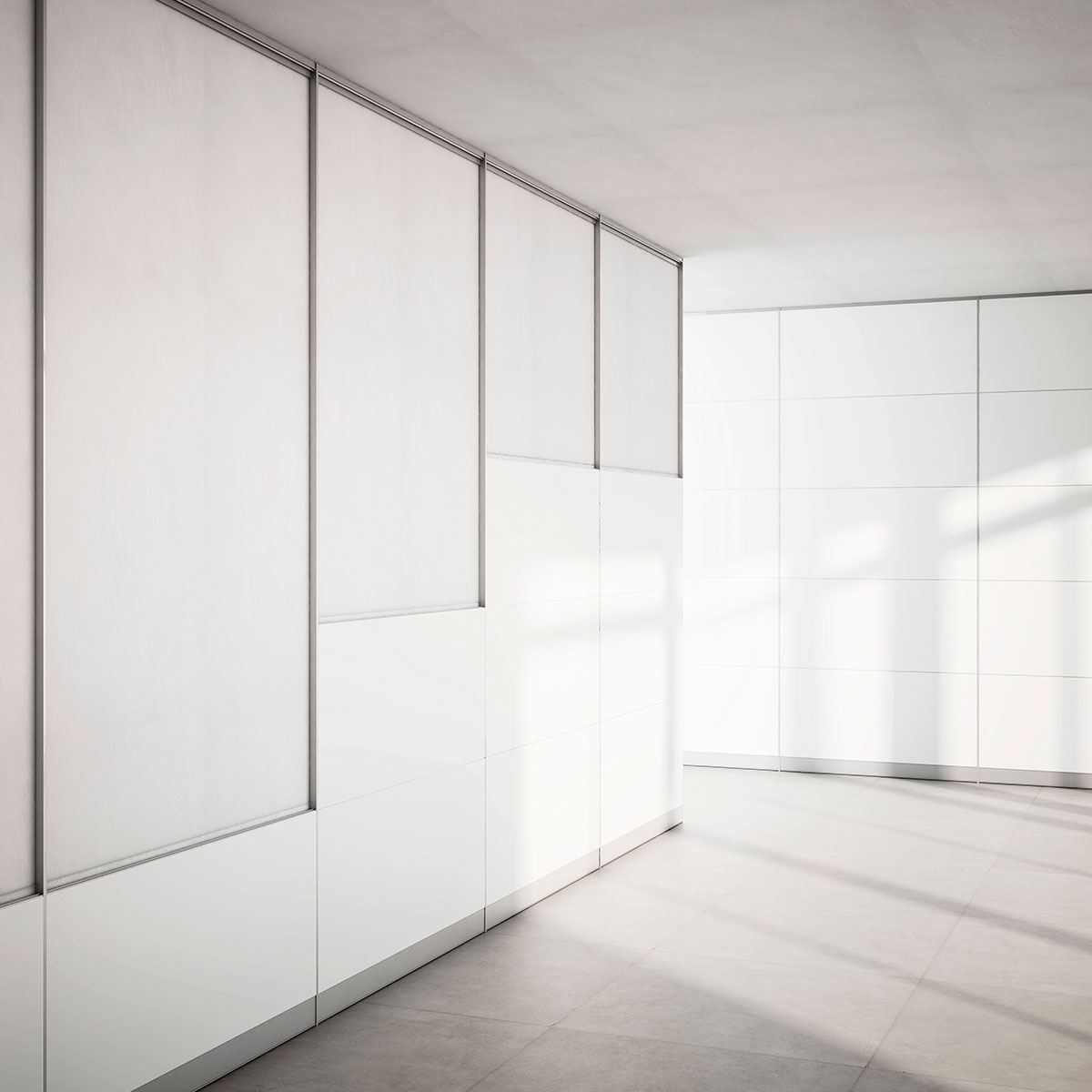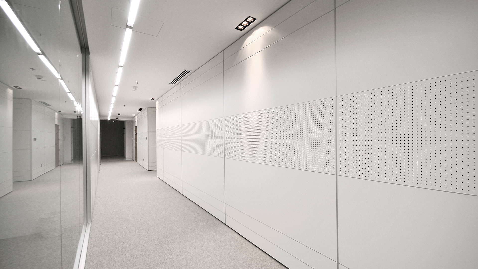 Sistema modulare composto da pannelli di diverse dimensioni e tipologie di foratura o fresatura. Permette di organizzare gli spazi fra pannello e pannello, liberi da qualsiasi vincolo dimensionale, garantendo adeguata collocazione e facile accesso tanto dei pannelli fonoassorbenti quanto degli impianti di qualsiasi tipo e forma.